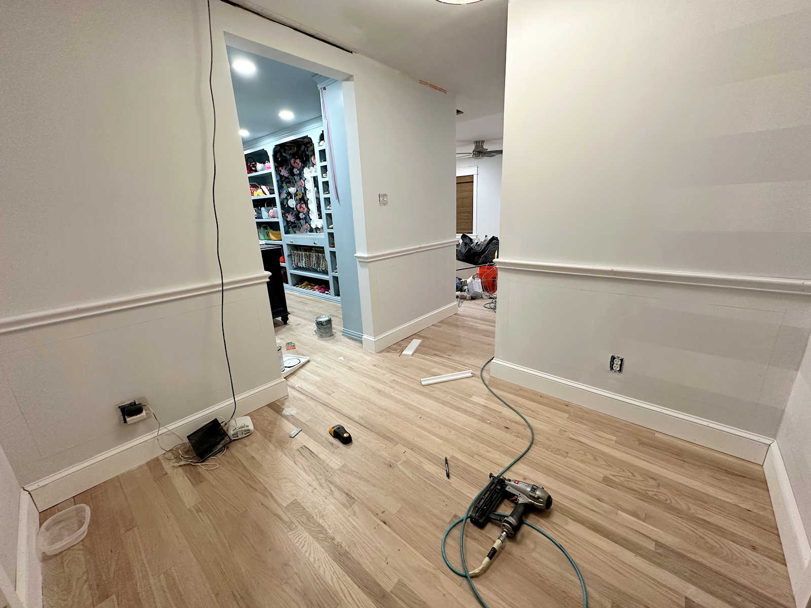 Since the walk-in closet doorway is different from all the other doorways in the house (i.e., taller and just drywall wrapped around the jambs instead of trimmed out), I decided to wrap the chair rail around the door jambs. Since it’s different, I wanted it to be very obviously different so that it looks very intentional. I really love how this turned out.