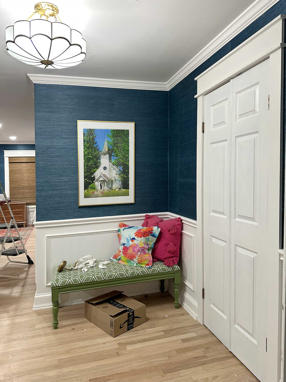 I had originally planned on keeping the thin gold frame that’s has been on the picture for years now. But that frame is so thin that I kept wanting to put something else on that wall with it, and my mind naturally went to sconces since I really like wall sconces.