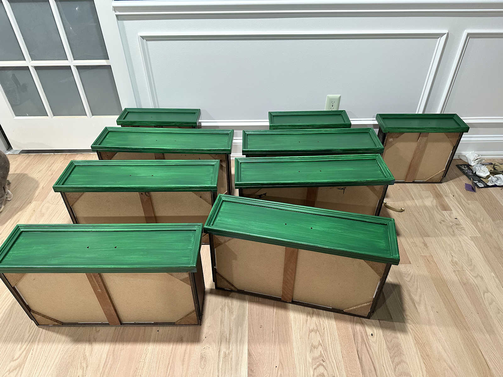 So here’s that dark green after two coats of paint. I think the color is called Shamrock. The picture looks funny because I sent it to my mom, and I had folded the area rug back onto itself, so the really dark gray backing on the rug was showing. She removed that because it was really distracting.