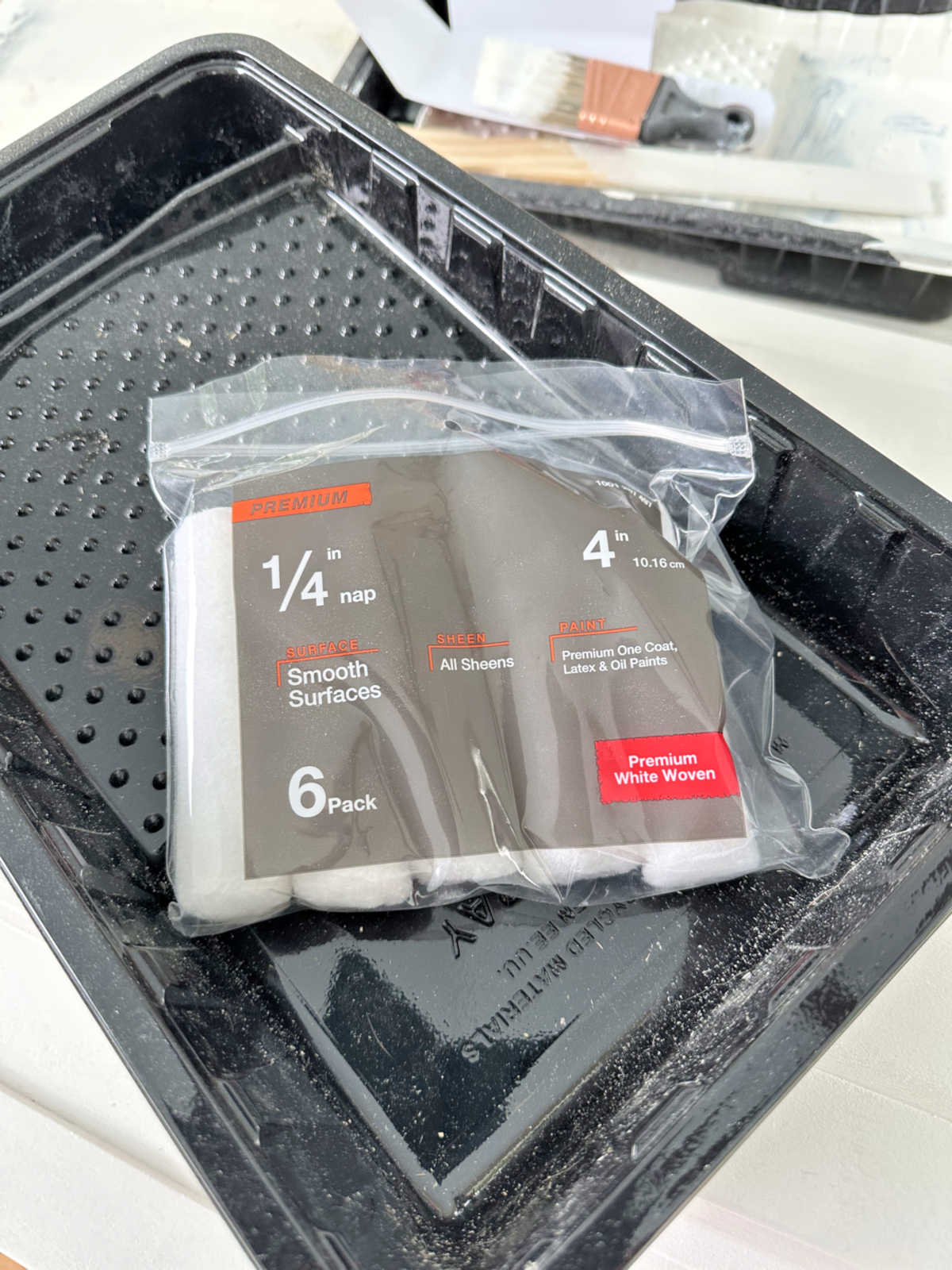 Anyway, like I said, it’s now the only primer I’ll use on raw, unfinished wood that I want to paint. The one problem with the shellac-based primer is that I don’t like putting it into my paint sprayer because it required chemicals to clean. So I apply it with a brush and/or a roller. For my closet island drawer fronts and doors, I used these 4-inch rollers for smooth surfaces.