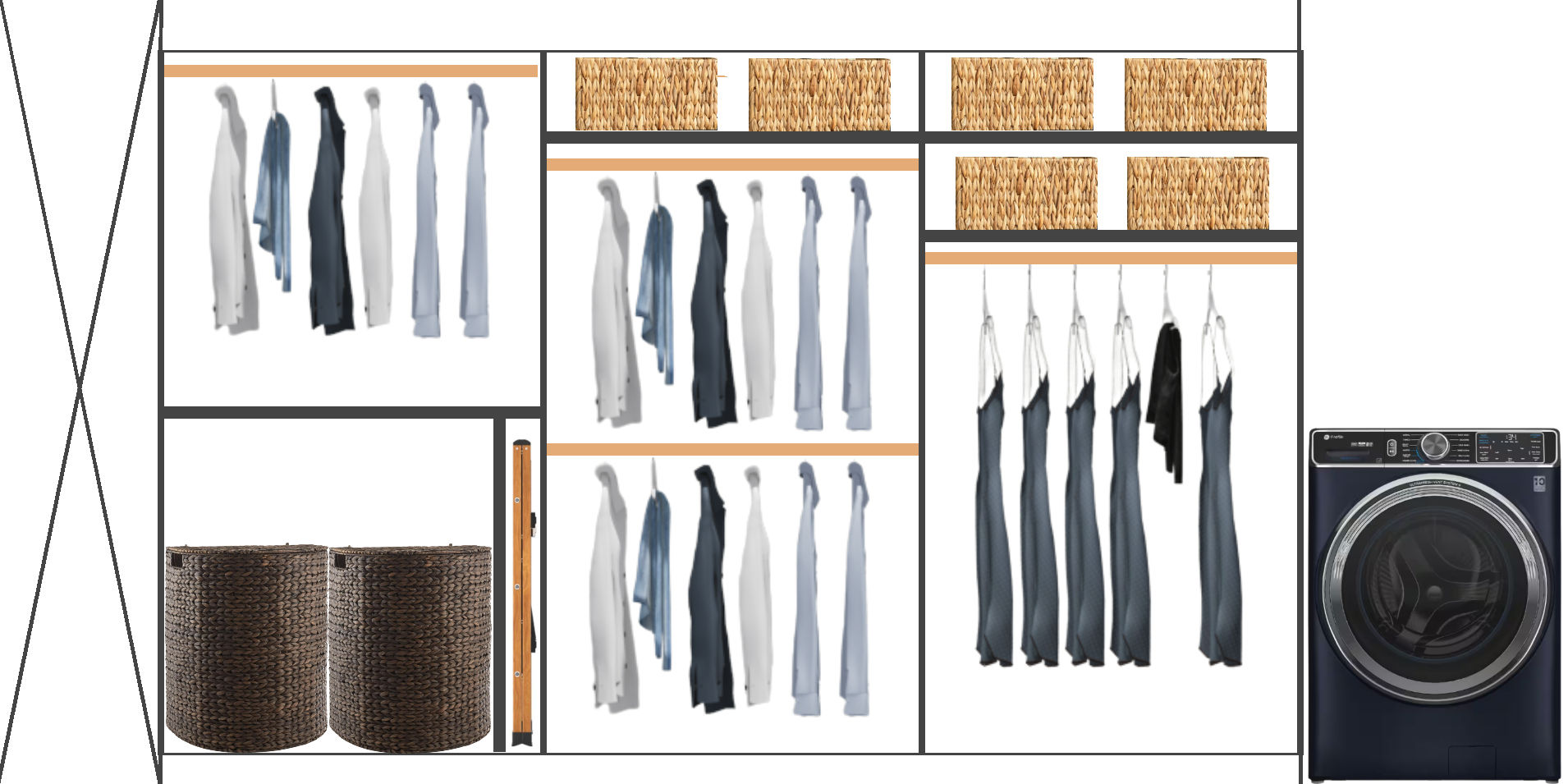 …to looking like this, with a space for laundry hampers tall enough so that the lids will open, a dedicated slot for the step ladder, and the hanging bars for the clothes I wear regularly brought down lower so that they’re easily reachable for me. The hanging bar on the far left section is still high, but that’s where I’ll hang things I don’t need to access on a regular basis.
