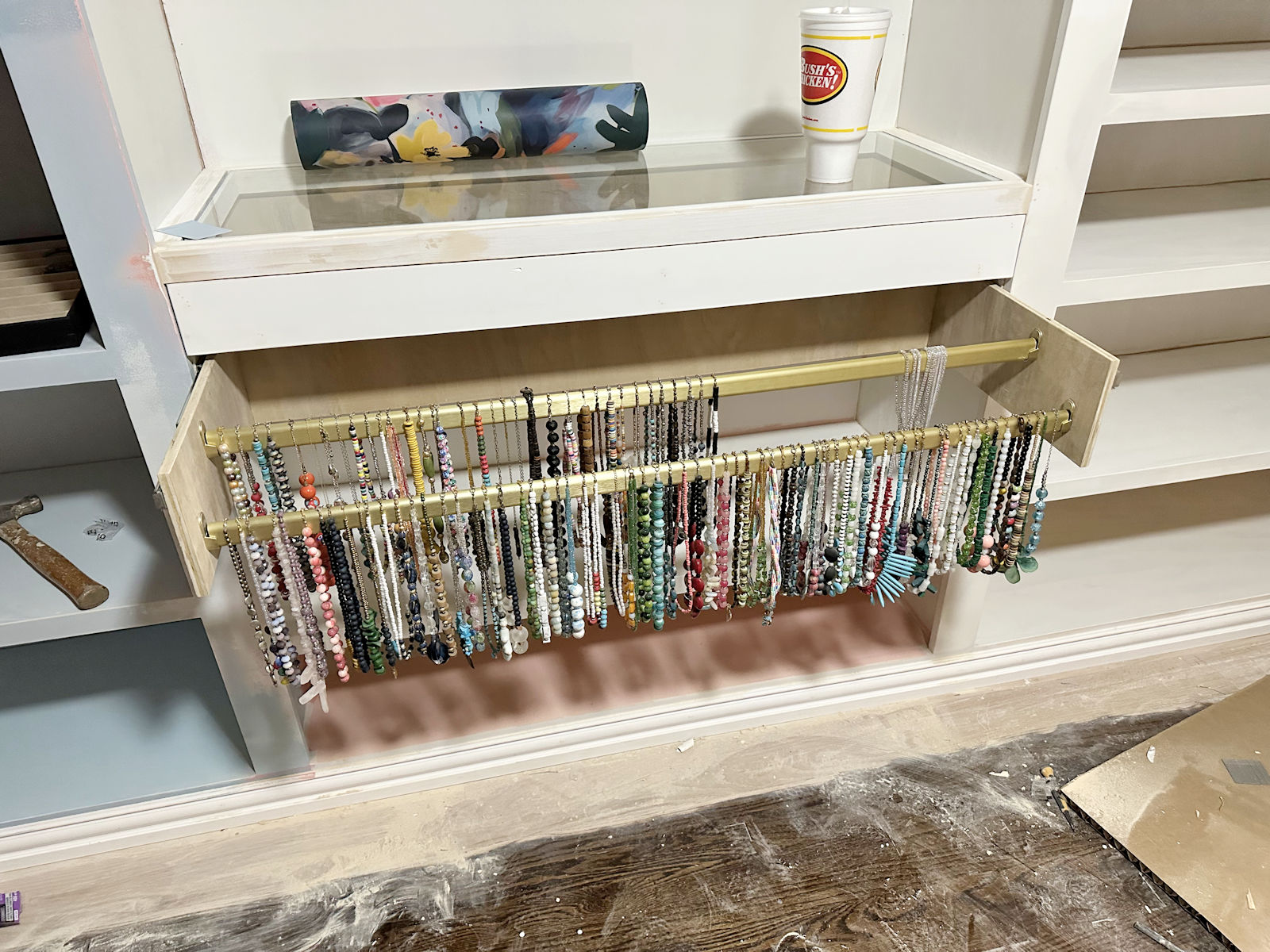 If I can figure out that final piece, I will officially have every single part of the perimeter cabinets built. This necklace storage was the last thing I had to figure out and build, and those finishing touches on the necklace storage are the final pieces of the puzzle.