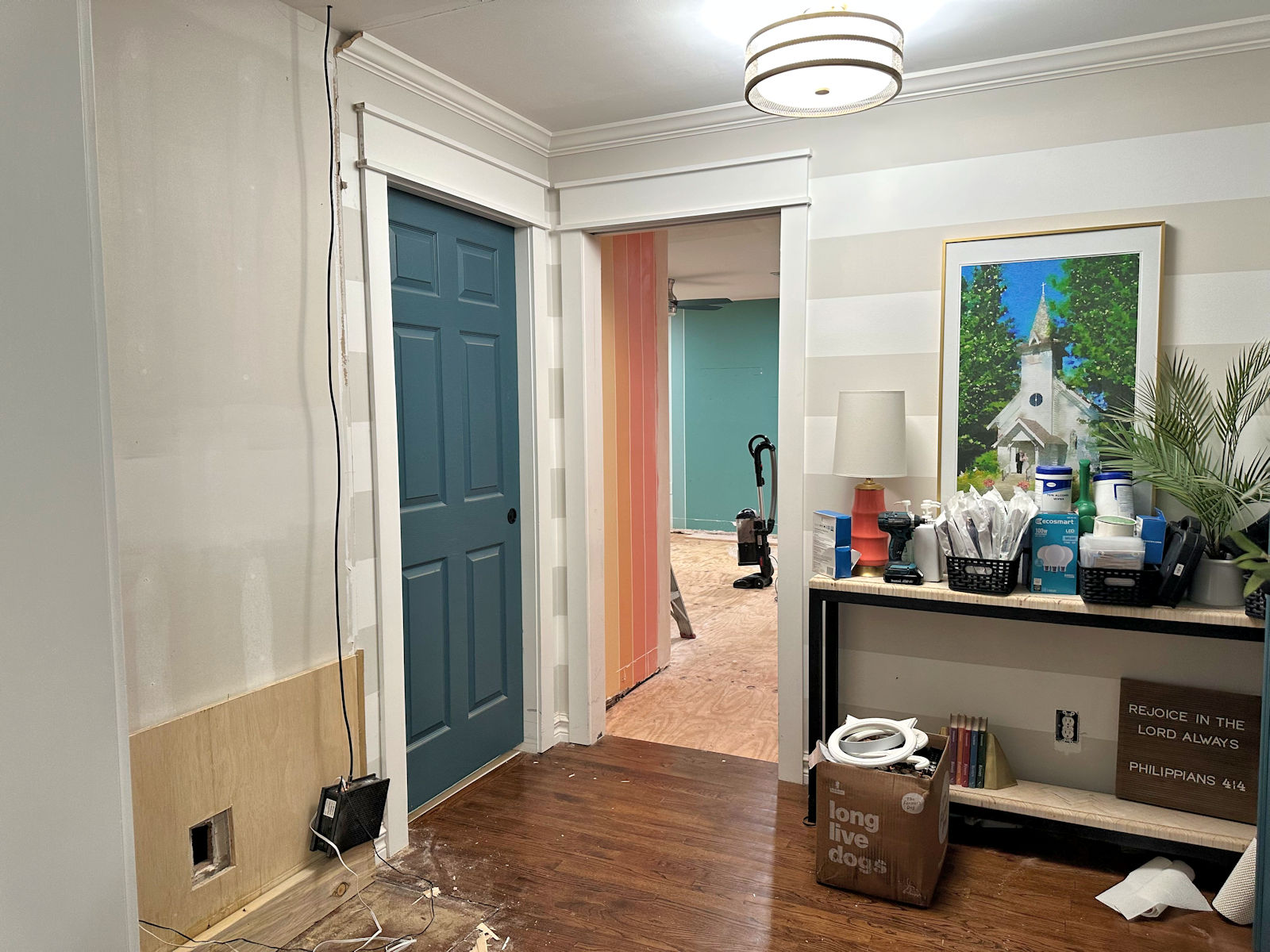 Let me explain my thought process. As you know, I’m in the process of turning everything past the music room cased opening into our bedroom suite. The hallway will now be a sort of anteroom that is open to the bedroom, and the former guest bedroom will be our closet and laundry room combo. The doors to the hallway bathroom will eventually be relocated so that the bathroom is accessible via a more public area of the house and not through our bedroom suite.