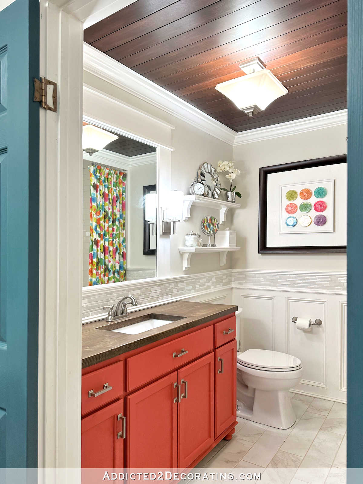 Then there was a really quick stint the place the self-importance was grey (bleh), after which in 2021, I did a extra in depth makeover on the toilet, and that’s after I painted the self-importance this coral-orange coloration.