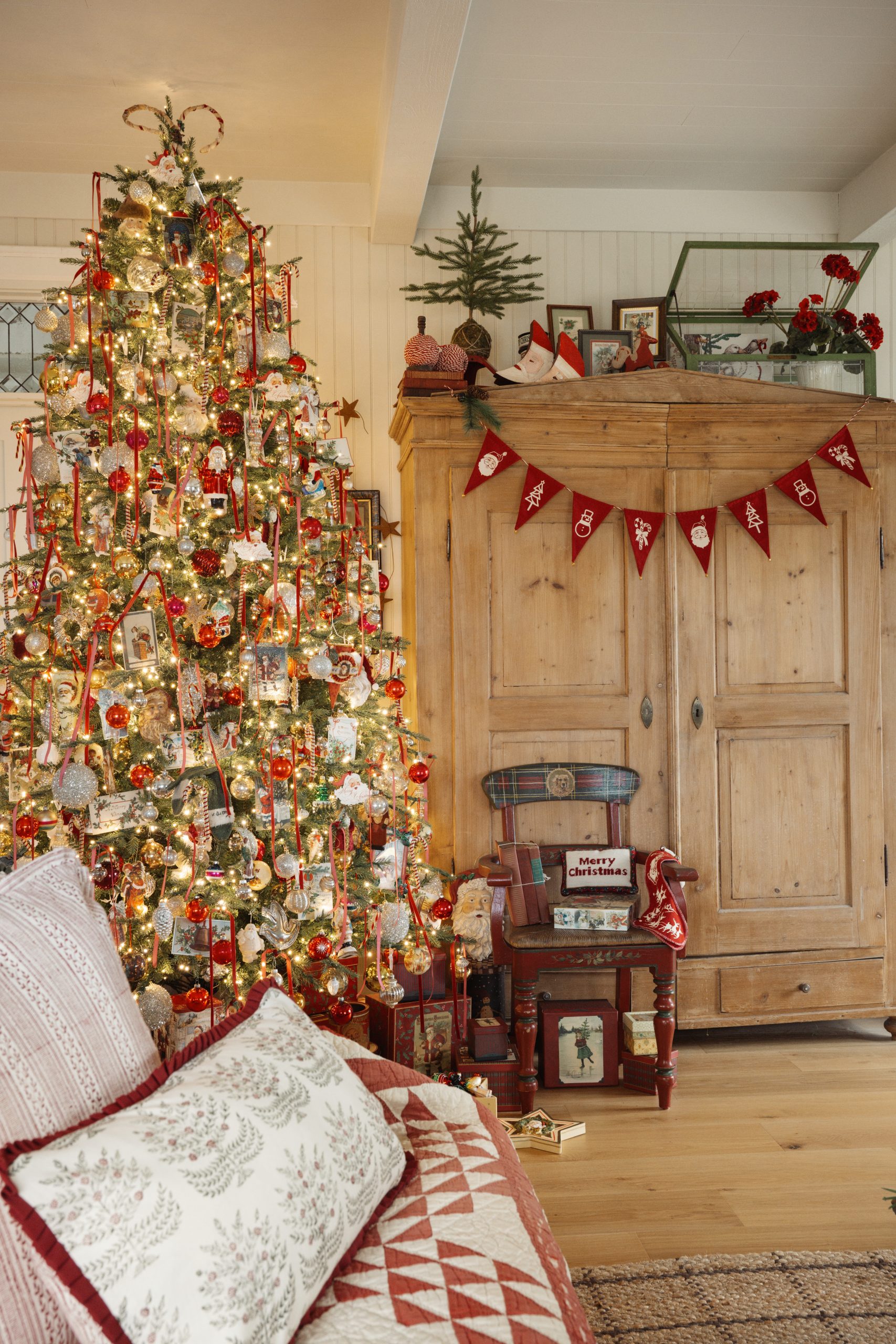 Adding cozy layers is key to creating that old-fashioned look. Velvet bows and ribbons, ornaments of difference sizes and materials. Also timeless to me can also mean “implied Christmas decor items.” It doesn’t have to have a Santa or say Christmas on it, implied decor is like red stripping or an old linen pattern that just feels like the holidays, it can be something other than a poinsettia print, in my chase this lovely chair to showcasing the perfect color scheme for the holidays .