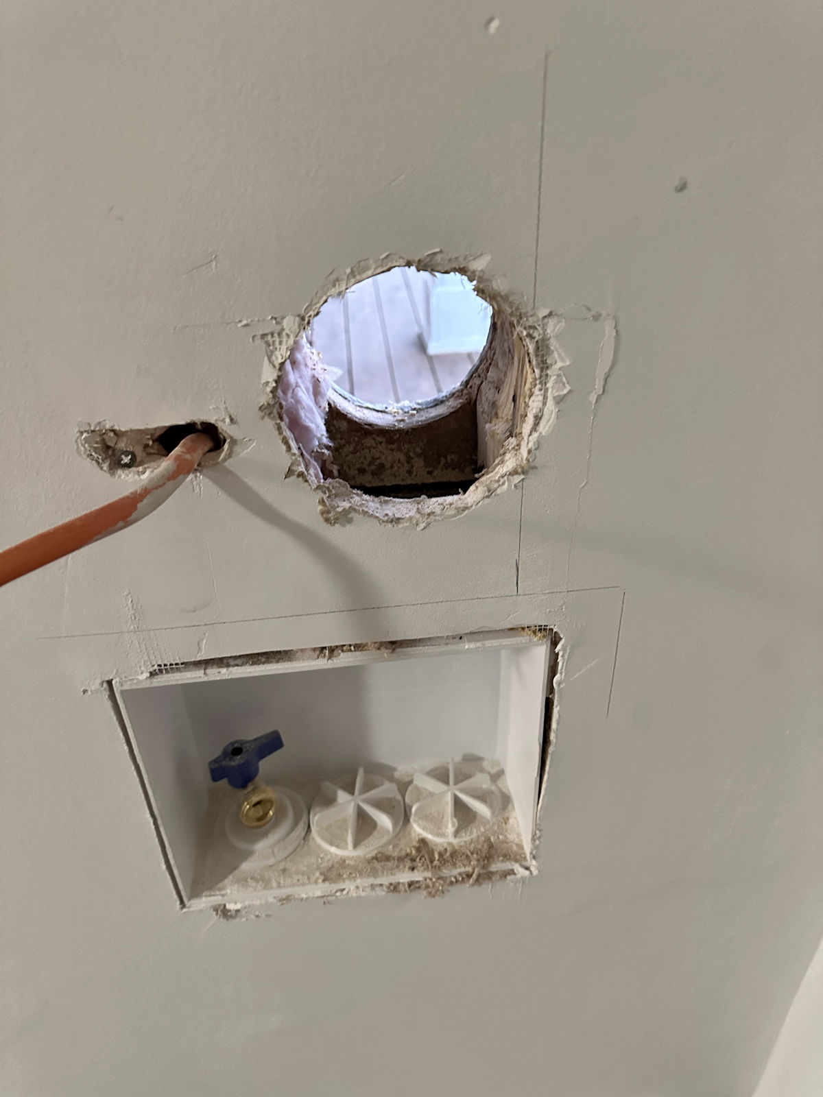 And here’s what it looked like from the inside. I did catch a bit of that wood on the right, but again, that’s not a supporting stud. That a piece of wood they had attached to the stud so that they could attach the box for the water hookup in that particular place. So don’t worry. I didn’t actually remove any wood from an actual supporting stud.