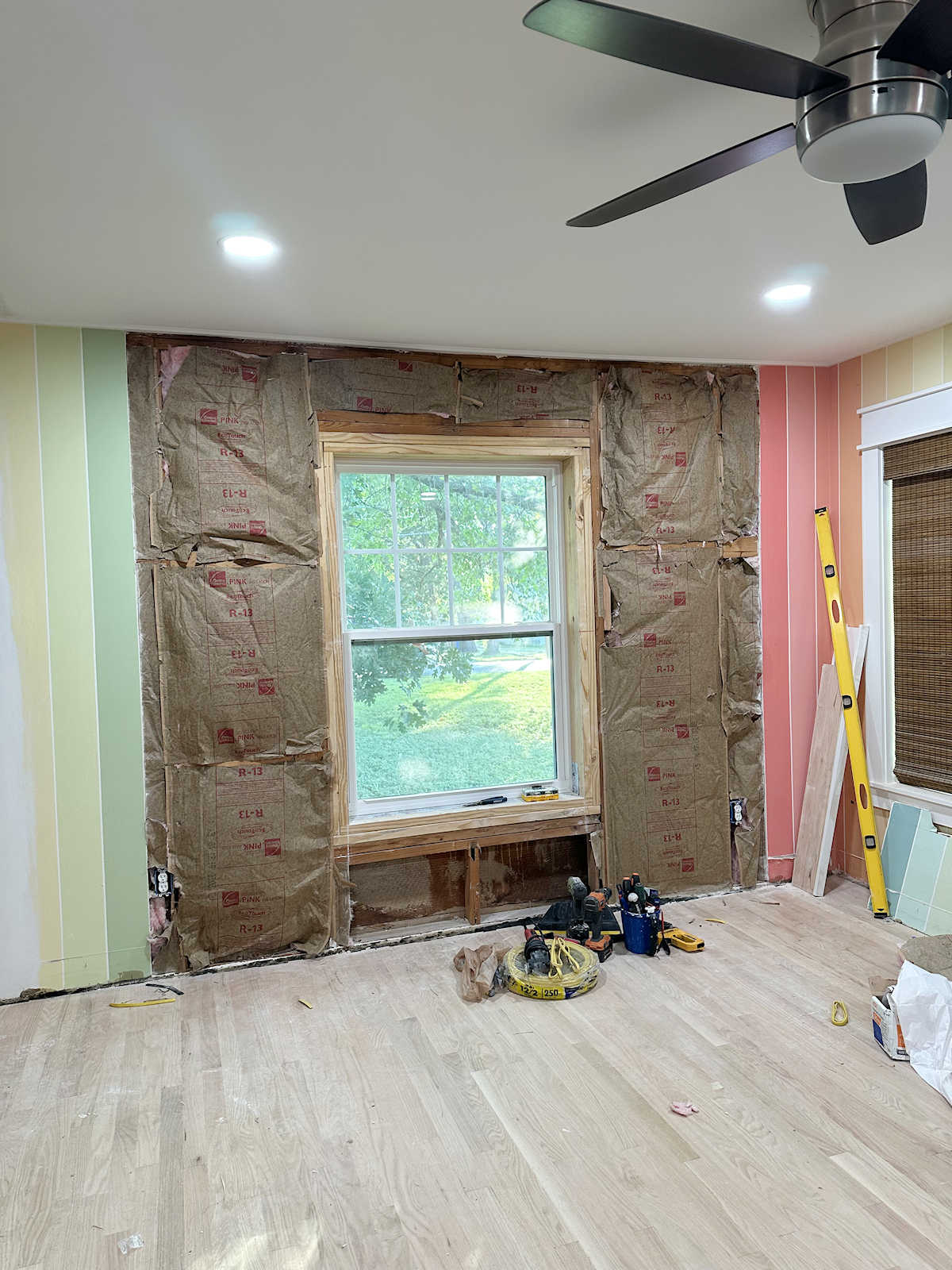So it’s all pretty boring stuff up to this point. I did try mudding the white stripes on the striped walls, and I don’t think that is going to work. After the mud dried, I could still feel those stripes.