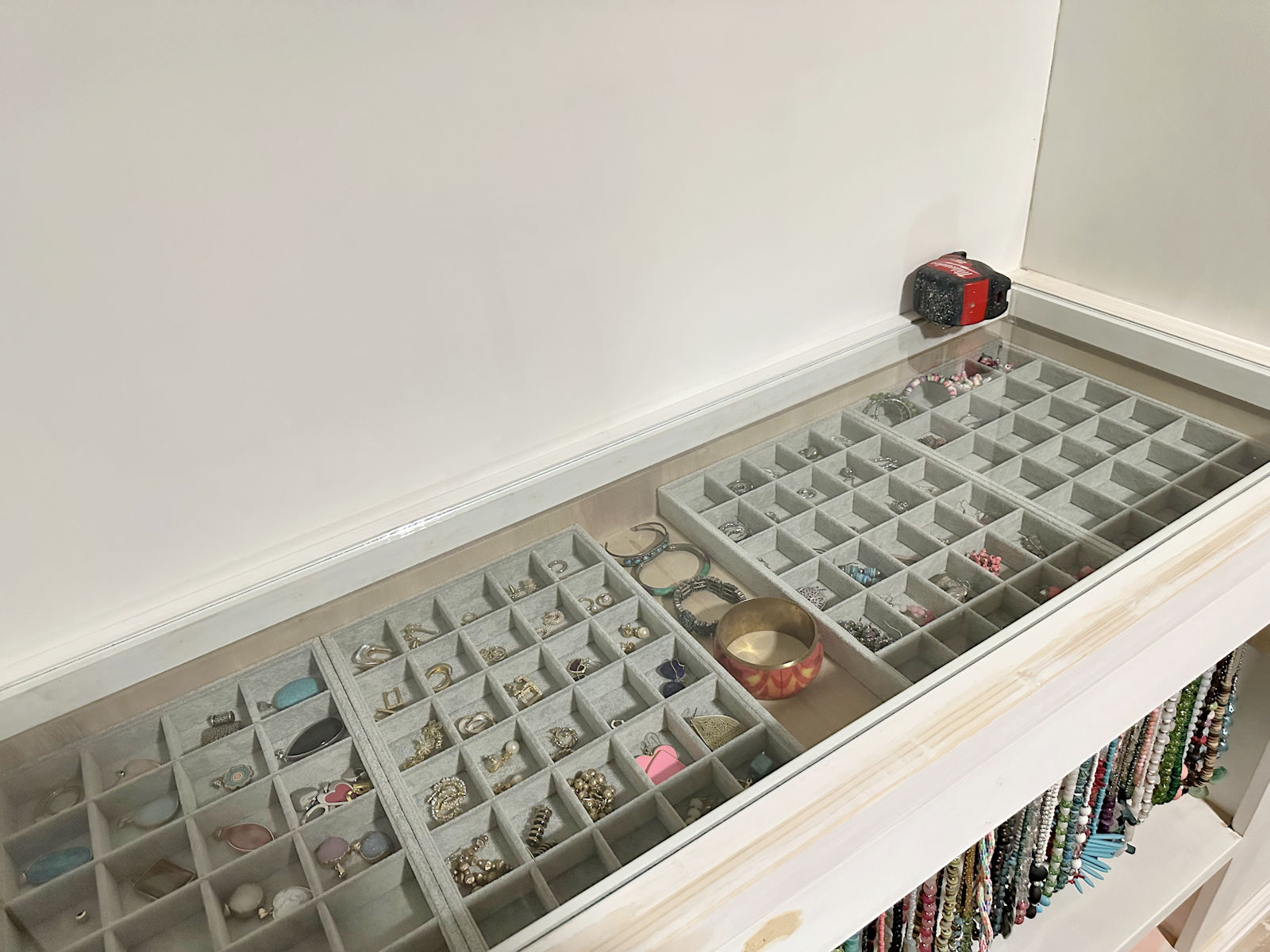 A couple of days ago, I showed y’all the jewelry drawer with the glass top that I built in my walk-in closet. It’s a pretty big drawer with interior dimensions of 41 5/8″ x 15″.