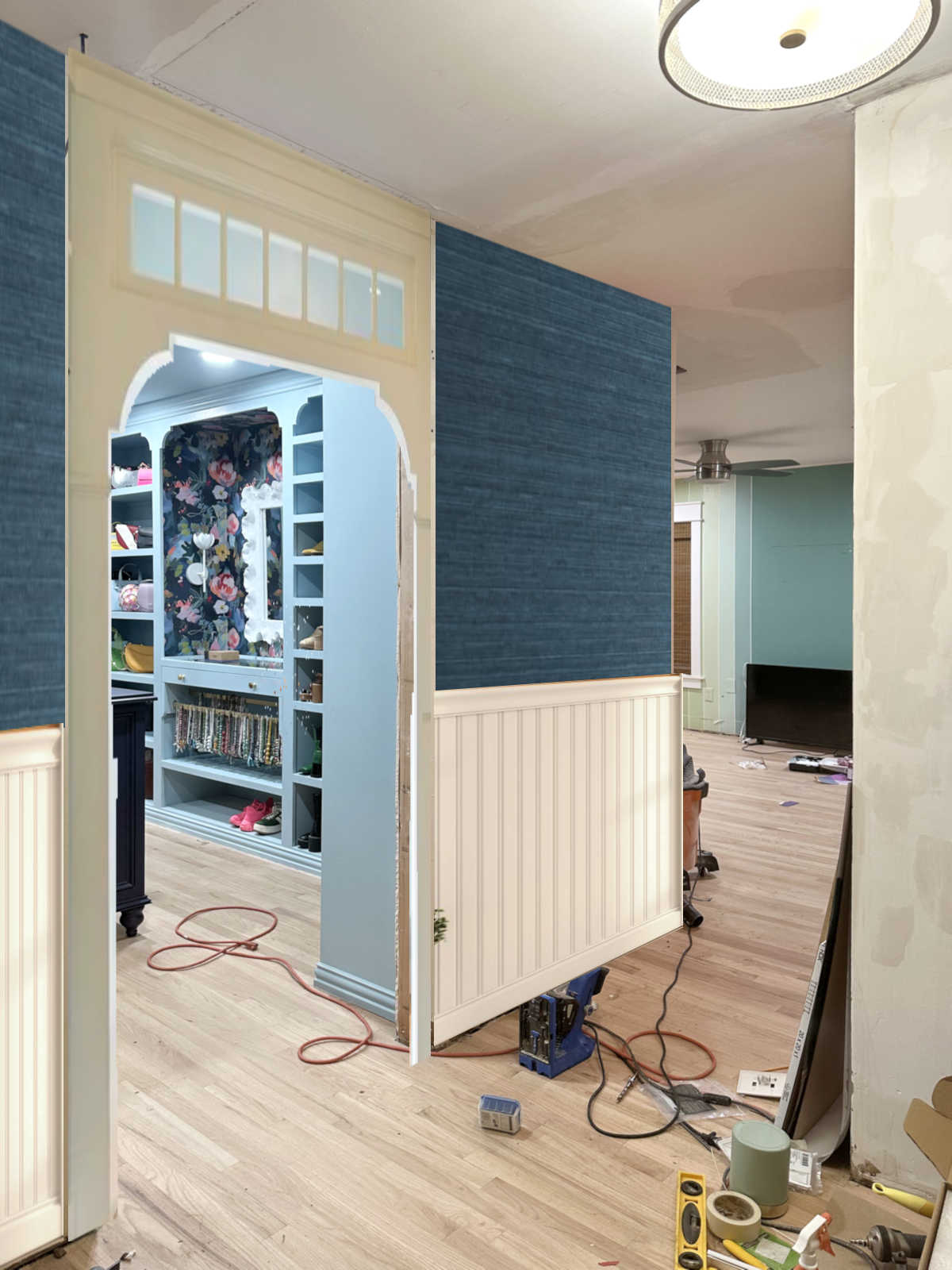 I like that it’s simple. It doesn’t turn the closet into the feature of the bedroom suite. And it allows me to keep that continuous flow of the wall treatment from the foyer into the bedroom. I think, in this case, simple is the best option. And it’s very rare that you’ll hear that coming from me. 😁 I’m generally a “more is more” kind of person, but in this instance, I do think I need to keep it simple. This simple option allows a peek into the closet with my pretty cabinets, wallpaper, mirror, etc., while the uninterrupted grasscloth and wainscoting lead the eye from the foyer into the bedroom. So mark the date. This is the one time I’m choosing the simple option.