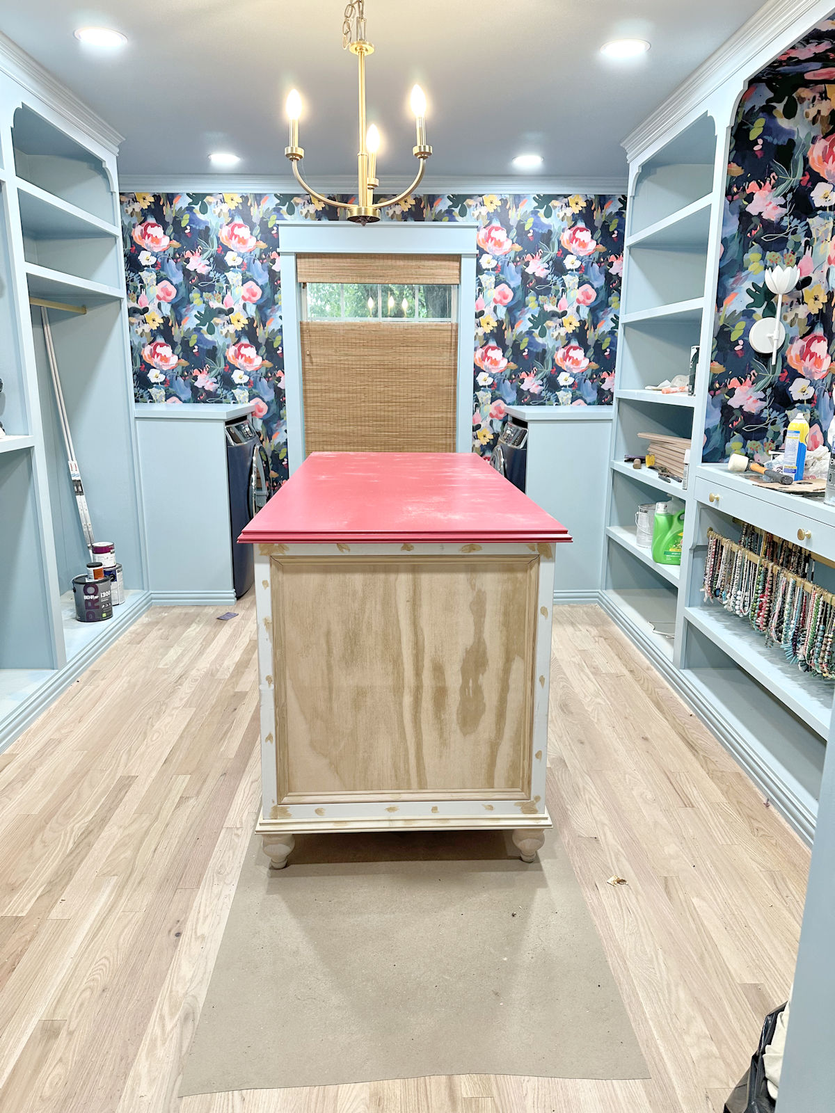 When I said I wanted to paint it an accent color, I’m sure most of you knew that the color I wanted is pink. I didn’t know which pink, though. And the only pink I had on hand was a very dark reddish pink. But that’s the one I tried just to see what a pink (or pink-ish) island would look like in the room. For the record, I know for sure that this isn’t the one I would choose, so I’m not looking for input on this particular color.