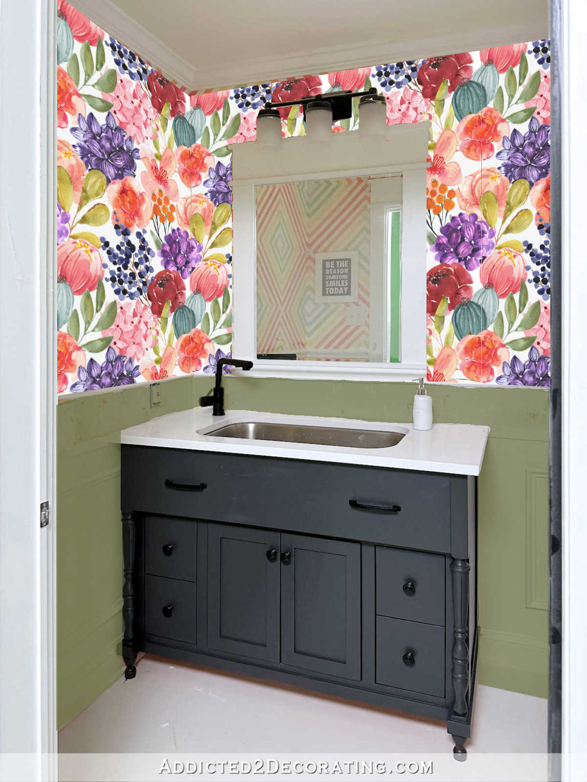 So I have now decided to have my floral wallpaper printed smaller (actual repeated wallpaper instead of the larger mural size that’s on the studio wall) and use that on the upper walls in the bathroom. I still haven’t decided on the wainscoting color. I did two mockups to test out two colors, and then I left one of them white. You’ll have to ignore the reflection in the mirror, but here’s what it might looks like with green wainscoting. I’d use the same green that’s in the back entry of the studio.