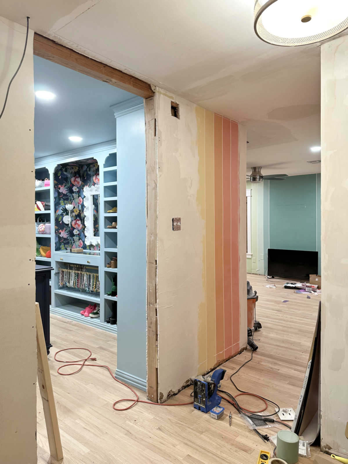 That turned out to be okay since I ended up color drenching the closet in blue and painted the ceiling the same blue as the cabinets. I wouldn’t want to have to use that same blue on the ceiling throughout the whole bedroom suite, so those 2x4s created a natural stopping point. So in the end, I was glad they were there.