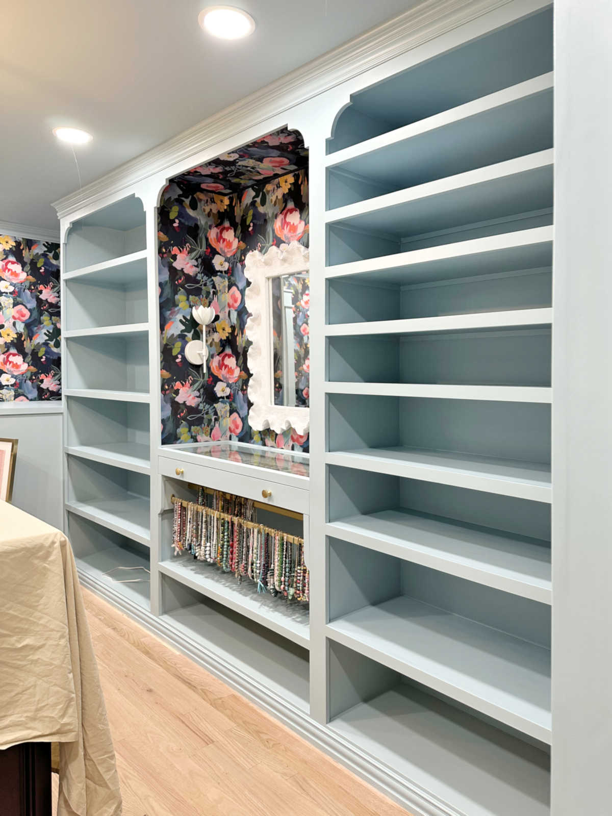 So we first got the protective paper out from underneath island since the island base is now completely finished. And then while I helped Matt with his lunch, she got busy clearing out all of the tools and supplies from the room and then started cleaning. Each shelf had to be vacuumed and then wiped down. She wiped down all of the trim, vacuumed all of the baskets, and even dusted off my necklaces. She also vacuumed the floor, but it will need a more thorough cleaning once every single thing is checked off of my list.
