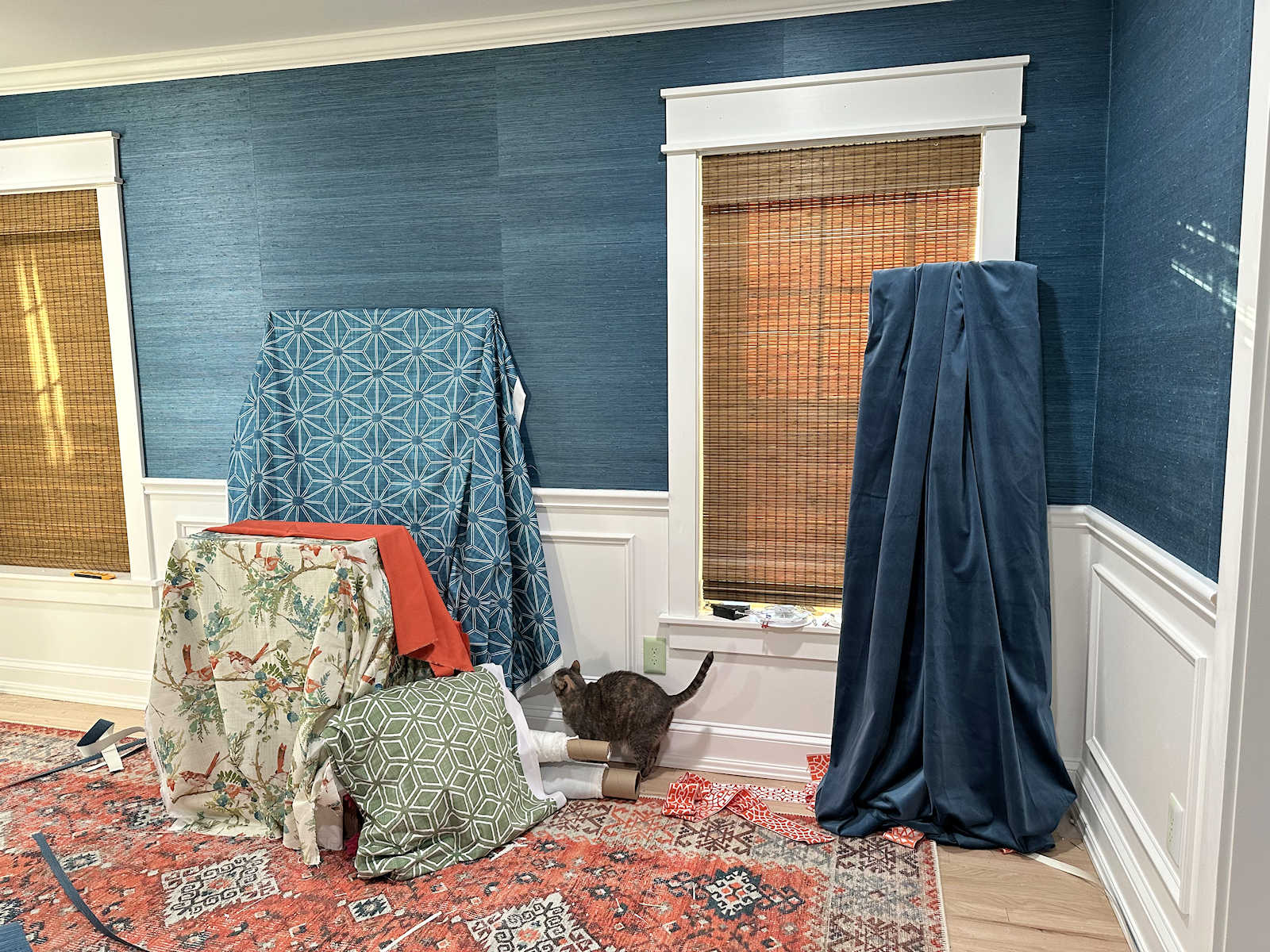 And it’s just in time because the two fabrics I ordered from Spoonflower arrived yesterday, which means that I can make all of those final decisions (like the final decision on which direction to use the drapery fabric, which I shared about two days ago), and get started on all of the soft furnishings in the room.