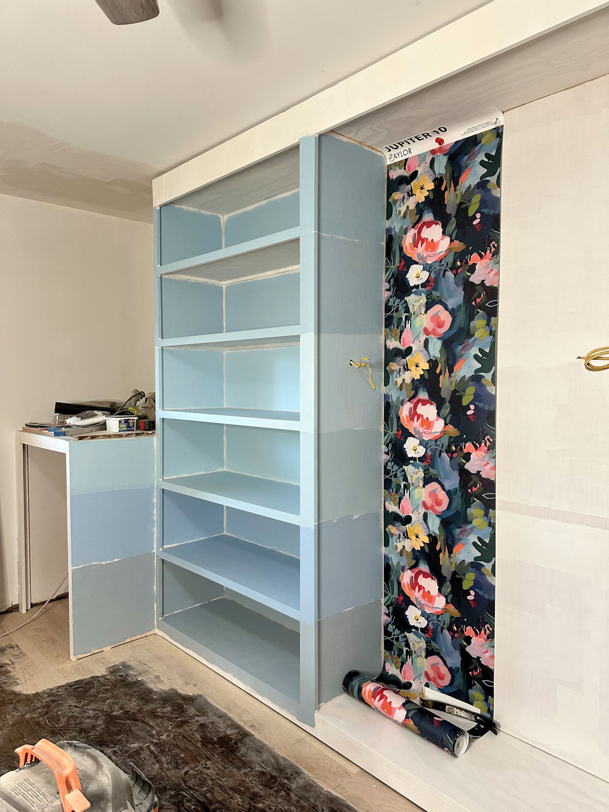 Picking out a blue paint color can be tricky because the last thing I want is for my closet to read “baby boy’s room”. And some of those blues in the wallpaper, if used on all of the cabinets, could very easily look like a room intended for a child.