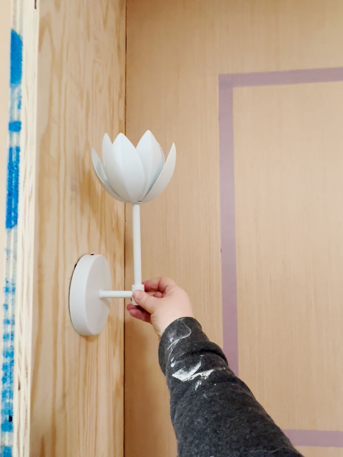 I tried to get a picture showing the sconce and wallpaper going the right direction. It’s an awkward angle, but this gives us a better idea of what it will look like against the wallpaper.